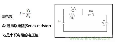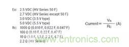 除了部份生產(chǎn)商直接提供參數(shù)值外,“漏電流值”可通過向超級(jí)電容器施加電壓直至特定時(shí)間后測量電阻器兩端的電壓,再根據(jù)以下簡單方程計(jì)算便能得出。
