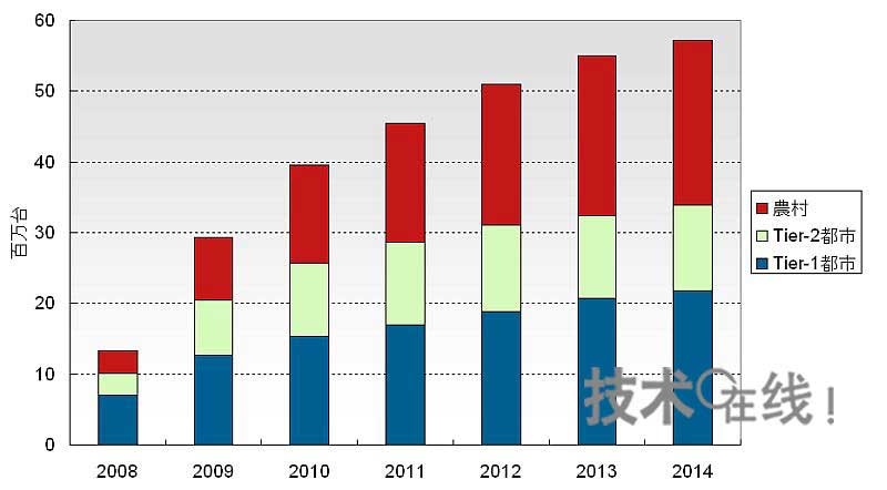 由于中國(guó)的城市人口不斷增加,2014年將超過(guò)中國(guó)人口的一半,達(dá)到56%,較10年前增長(zhǎng)14%。我們首次將中國(guó)的液晶電視需求按照“一線(xiàn)城市”、“二線(xiàn)城市”及“農(nóng)村”的劃分進(jìn)行了預(yù)測(cè)。在農(nóng)村,目前正在由顯像管電視向平板電視過(guò)渡,一線(xiàn)城市和二線(xiàn)城市每戶(hù)家庭擁有的電視數(shù)量將增加。根據(jù)經(jīng)濟(jì)的增長(zhǎng)程度,電視需求甚至有望超出預(yù)測(cè)。我們預(yù)測(cè),2014年中國(guó)液晶電視需求中,城市約占60%,增長(zhǎng)至3400萬(wàn)臺(tái)左右(圖2)。