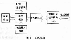 系統(tǒng)框圖見圖1。該系統(tǒng)的核心是主控模塊,主要由微處理器構成,控制整個系統(tǒng)軟硬件的運行。一方面處理各部分外圍電路的控制信息,另一方面完成接收和需要發(fā)送的信息的智能化處理,其功能具備可擴展性,為以后功能進一步加強保留軟件接口;存儲模塊包括外部RAM、EPROM存儲器和相應的掉電保護電路,用于存放系統(tǒng)運行中需要處理、交換的數(shù)據(jù),同時還用于存儲接收到的或需要發(fā)送的數(shù)據(jù)信息;EPROM主要用于存放系統(tǒng)軟件及存放漢字字庫;鍵盤輸入模塊用于接收來自用戶的輸入數(shù)據(jù),包括控制信息和數(shù)據(jù)信息,它是用戶對該系統(tǒng)的輸入接口;LCD模塊由LCD顯示器及相關控制電路組成,可以顯示中文、英文、數(shù)字和各類字符,它是該系統(tǒng)對用戶的輸出接口。MODEM模塊由一片嵌入式MODEM芯片及相關外圍電路組成。一方面用于調制由主控模塊送來的數(shù)據(jù),將數(shù)字信息轉化為模擬信號,送入前端電話接口模塊DAA電路;另一方面將DAA電路接收的模擬信號轉化為數(shù)字信號,并交給主控模塊進一步處理。它是所有信息的進出口,起著至關重要的作用。