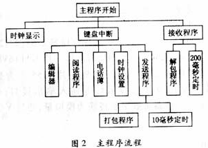電話終端的核心是MCS-89C52微處理器。通常情況下,微處理器工作在低功耗方式,當有鍵按下時,退出低功耗模式,進入主菜單。在主菜單中,用戶可以選擇操作。為減少冗余代碼,軟件采用匯編語言編寫,字庫固化在外部擴展的EPROM中,內(nèi)部EPROM存放程序。圖2為主程序流程。