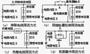 遠(yuǎn)遠(yuǎn)高于鋁聚合物電解電容器的紋波電流承受能力。必須考慮上電過程的沖擊電流限制??梢圆捎肁C/DC變換器上電電流限制方法,如串聯(lián)限流電阻,見圖2(a),則: