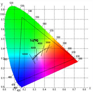 定義您的色域并不簡單。大多數LED制造商的規(guī)格數據中并沒有提供其LED的色度坐標。不過,當您有了色度坐標后,就可輕易標出LED在色彩空間中的位置,如圖2所示。圖中系統(tǒng)色域的三角形覆蓋在CIE 1931色彩空間的上面。CIE 1931 色彩空間代表人眼能看到的所有顏色;在色彩曲線外的是波長,此數據描繪了色度坐標。在這個圖中,加入了普朗克軌跡(Planckian locus),或為一個黑體加上顏色,代表黑體在溫度變化時在色彩空間的坐標。以普通詞匯來說,這坐標代表不同種類的白光通過CCT之后的結果。