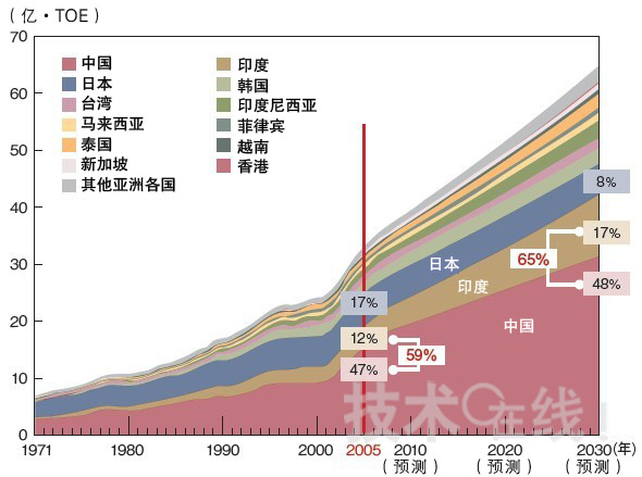 當(dāng)然,印度的能源需求也在持續(xù)增加。截至2005年,印度的能源需求占整個亞洲的12%,僅次于中國、日本,位列第三。而到2030年,這一數(shù)字估計將達(dá)到17%,超越日本,成為亞洲第二(圖1)。