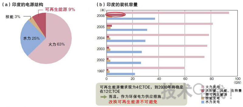 為了解決上面不穩(wěn)定的電力供應(yīng)和環(huán)境問題,可再生能源成為了關(guān)注的焦點。民間調(diào)查機構(gòu)的推測顯示,到2030年,印度對于可再生能源的需求將增加到現(xiàn)在4億TOE(石油換算噸)的3倍,達(dá)到12億TOE。