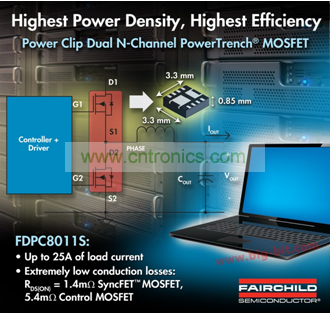 張瑞斌向記者介紹:“FDPC8011S專為更高的開關(guān)頻率的應(yīng)用而開發(fā),在一個(gè)采用全Clip封裝內(nèi)集成1.4m? SyncFETTM 技術(shù)和一個(gè)5.4m?控制MOSFET、低質(zhì)量因子的N溝道MOSFET,有助于減少同步降壓應(yīng)用中的電容數(shù)量并減小電感尺寸。該器件具有源極朝下和低側(cè)MOSFET可以實(shí)現(xiàn)簡單的布局和布線,提供更緊湊的線路板布局并獲得最佳的散熱性能。”FDPC8011S具有超過25A的輸出電流,與其它普通3x3mm2 雙MOSFET器件相比,輸出電流容量提高了2倍。