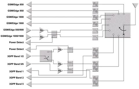 隨著多頻段架構(gòu)的普及,對功率放大器和相關(guān)濾波器的數(shù)量提出了嚴(yán)格的要求。事實(shí)上,對功率放大器的技術(shù)要求沒有變化,但手機(jī)設(shè)計需要使用更多的功率放大器。因此真正改變的,是需要一種高效率方法,將所有射頻信號傳送給天線──即單片開關(guān)。