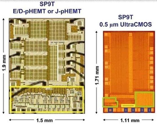隨著多頻段手機(jī)越來越流行,對高整合度、小型天線開關(guān)的需求也越來越迫切。UltraCMOSSP7T開關(guān)現(xiàn)在已經(jīng)開始量產(chǎn),SP9T也在2007年底投入量產(chǎn)。在外形方面,GaAsSP7T為1.6x1.5mm,而采用0.5umSOS制程、具有相等或較小和較大信號性能的相似SP7T開關(guān)設(shè)計只有1.2x1.0mm,面積縮小了一半。目前已經(jīng)可用的GaAsE/DpHemt或J-pHemtSP9T開關(guān)外形尺寸為1.9x1.5mm。與之相較,采用UltraCMOS0.5um制程制造的SP9T外形尺寸為1.7x1.1mm(圖3),它不需要外部ESD元件和性能增強(qiáng)匹配元件。依照UltraCMOS發(fā)展規(guī)劃,0.25um版本的SP9T尺寸將達(dá)到1.32x1.29mm。