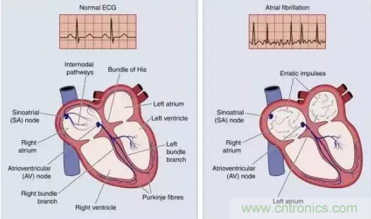 這種心律失常稱之為心房顫動(AFibrilation,AFibrilation,房顫),這是左心房和/或右心房(即心臟兩個上腔)的正常心跳異常。AFib會破壞心房和心室(即心臟的兩個下腔)之間的正常血流,并增加四至五倍中風的風險,因為它更容易形成血栓。事實上,AFib在血管里由凝塊或脂肪斑塊沉積引起的缺血性中風中占的比例達到15-20%。僅在美國,就有270萬和610萬人估計有AFib,預計這一數(shù)字隨著美國人口老齡化而增加,因為約2%的65歲以下的人和約9%的65歲以上的或更老的人患有AFib。