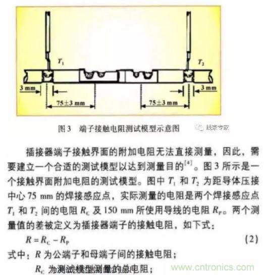 低電平接觸電阻測量法是使用微型歐姆表測試導(dǎo)線壓接和端子接觸區(qū)域的電阻。如圖3所示,使用微型歐姆表測量兩個(gè)焊接感應(yīng)點(diǎn)T、T間的電阻和l50mm長度的所使用導(dǎo)線的電阻,據(jù)此可計(jì)算出所需要的接觸電阻。