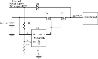 另外,MAX4842的過壓保護(hù)門限為4.4V-5.0V,也高于單節(jié)鋰電的4.2V上限電壓。電源切換電路是利用MAX4842的使能控制引腳/EN配合分壓電阻R1/R2實現(xiàn)的。當(dāng)沒有外部電源接入時,如果電池電壓高于2.8V-3.2V的保護(hù)門限,/EN被R2拉低,MAX4842驅(qū)動Q1、Q2的柵極為高電平使其導(dǎo)通,電池為負(fù)載供電;當(dāng)有外部電源接入時,通過R1/R2分壓后在/EN引腳上產(chǎn)生的電壓高于1.47V后MAX4842被禁止,Q1、Q2被關(guān)閉,由外部電源給負(fù)載供電。圖中的二極管D2用于阻斷灌入外部電源的反向電流,并防止/EN被錯誤拉高。由于它串在外部供電通路上,損失一點效率沒有關(guān)系。