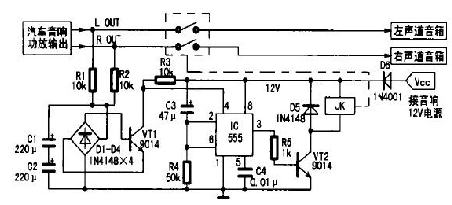 1.在接通音響電源的瞬間,因電容C3兩端電壓不能突變,可視為短路,則時(shí)基電路555的②、⑥腳電位高于2/3 Vcc,故555處于復(fù)位狀態(tài),③腳輸出低電平,晶體管VT2截止,繼電器JK常開觸點(diǎn)不動(dòng)作。同時(shí)+12 V電壓通過電阻R4向電容C3充電,延時(shí)約5s(秒鐘)后555的②、⑥腳電位降低至1/3Vcc,555被觸發(fā)置位,③腳由低電平變?yōu)楦唠娖剑w管VT2導(dǎo)通,繼電器JK得電,常閉觸點(diǎn)閉合,從而實(shí)現(xiàn)了延遲一段時(shí)間將揚(yáng)聲器接入功放,徹底消除了開機(jī)時(shí)大電流對(duì)揚(yáng)聲器的沖擊;