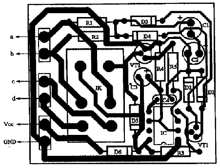 具體制作如下:先把功放輸出端與音箱的引線切斷,按圖2所示電路將引線頭a、b分別接功放的兩組輸出端,c、d分別接左、右聲道音箱:揚(yáng)聲器保護(hù)電路的電源只能從收放機(jī)中獲取,不可直接從汽車12 v電源中獲取,否則不起開/關(guān)機(jī)保護(hù)作用;若是柴油車所配置的收放機(jī)(使用24 V電源),則要求增加一個(gè)降壓電路(見圖3所示),給揚(yáng)聲器保護(hù)電路供電,以免電源電壓過高損壞IC。