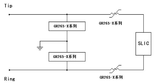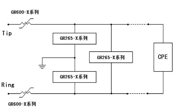 目前本公生產(chǎn)的GR265-X和GR600-X 等系列高分子PTC 熱敏電阻和半導(dǎo)體固體放電管一起用于總配線架的保安單元中,可以滿(mǎn)足過(guò)流和過(guò)壓保護(hù)的要求,同時(shí)幫助保安單元滿(mǎn)足中國(guó)通信行業(yè)標(biāo)準(zhǔn) YD/T 694-1999-2002、北美 TelcordiaGR-974 及 ITU-T K.20 等標(biāo)準(zhǔn),典型的使用電路如上圖所示。