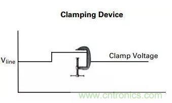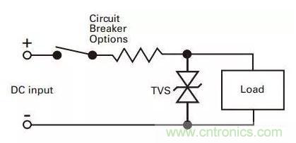 在實(shí)際的電路中,如圖2所示,在DC input的時(shí)候,有時(shí)由于供電環(huán)境的變化會(huì)帶來(lái)一些瞬時(shí)脈沖。而要消除瞬時(shí)脈沖對(duì)器件損害的最好辦法,就是將瞬時(shí)電流從敏感器件引到地,一般具體做法是將TVS在線(xiàn)路板上與被保護(hù)線(xiàn)路并聯(lián)。這樣,當(dāng)瞬時(shí)電壓超過(guò)電路正常工作電壓后,TVS將發(fā)生雪崩擊穿,從而提供給瞬時(shí)電流一個(gè)超低阻抗的通路,其結(jié)果是瞬時(shí)電流通過(guò)TVS被短路到GND,從而避開(kāi)被保護(hù)器件,并且在電壓恢復(fù)正常值之前使被保護(hù)回路一直保持截止電壓。而當(dāng)瞬時(shí)脈沖結(jié)束以后,TVS二極管再自動(dòng)恢復(fù)至高阻狀態(tài),整個(gè)回路又回到正常電壓狀態(tài)。