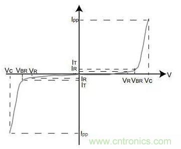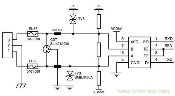 在智能儀表行業(yè)里一般采用RS-485通訊。下圖所示為RS-485通訊接口的典型應(yīng)用。在保護(hù)RS-485接口不被靜電或者浪涌損壞通常用SMBJ5.0CA來(lái)做接口保護(hù)如下圖3所示,當(dāng)靜電或者浪涌電壓高于5V時(shí),SMBJ5.0CA會(huì)開(kāi)始動(dòng)作,將電壓鉗位在很低的位置,如果電流超過(guò)了峰值電流IPP話(huà),最終電壓會(huì)被鉗位在9V左右,從而保護(hù)了后一級(jí)的器件不被損壞。