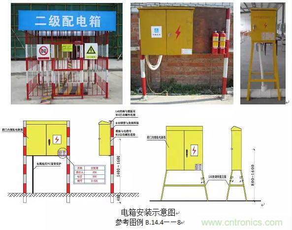 3、配電箱、開關(guān)箱應(yīng)裝設(shè)端正、牢固;固定式配電箱、開關(guān)箱的中心點(diǎn)與地面的垂直距離應(yīng)為1.4~1.6m;移動(dòng)式配電箱、開關(guān)箱應(yīng)裝設(shè)在堅(jiān)固的支架上,其中心點(diǎn)與地面的垂直距離宜為0.8~1.6m。(JGJ46-2005第8.1.8條)