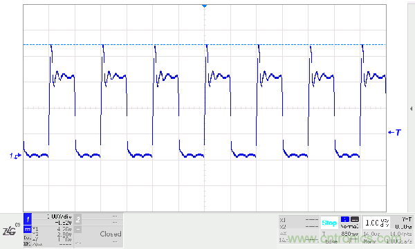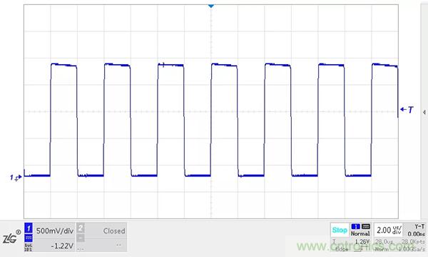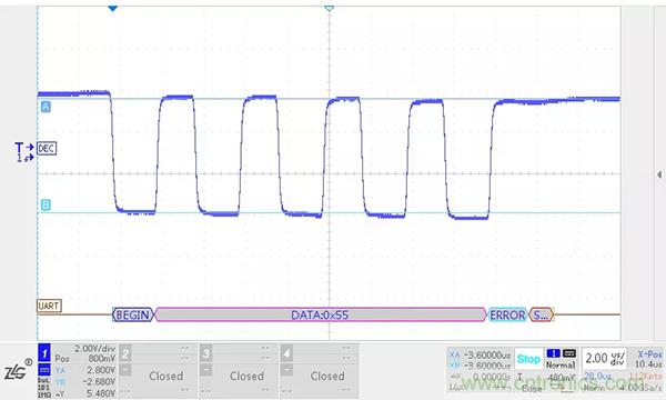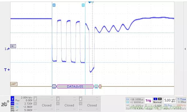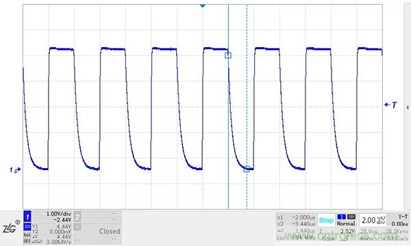在顯性狀態(tài)期間,總線的寄生電容會被充電,而在恢復到隱性狀態(tài)時,這些電容需要放電。如果CANH、CANL之間沒有放置任何阻性負載,電容只能通過收發(fā)器內(nèi)部的差分電阻放電。我們在收發(fā)器的CANH、CANL之間加入一個220PF的電容進行模擬試驗,位速率為500kbit/s,波形如下圖所示。