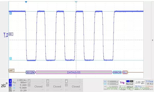 增加終端電阻使通信線纜上的電流增大,產(chǎn)生了較大的壓差,降低了接收端的信號幅值。RSM485ECHT在1200m,115.2kbps首端和末端的信號波形如下圖所示(0.75mm2通信線),末端信號與首端信號相比下降了0.7V左右。