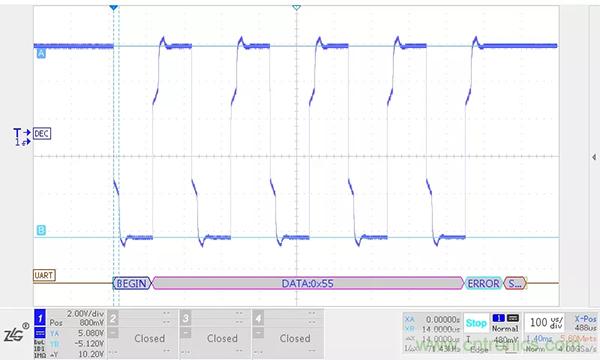 RS-485總線上的負載越大,RS-485收發(fā)器輸出差分電壓幅值越低,RSM485ECHT在5m,500kbps的情況下不加終端電阻和加終端電阻的波形如下圖所示。