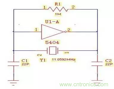 Y1是晶體,相當(dāng)于三點(diǎn)式里面的電感,C1和C2就是電容,5404非門和R1實(shí)現(xiàn)一個NPN的三極管,接下來分析一下這個電路。