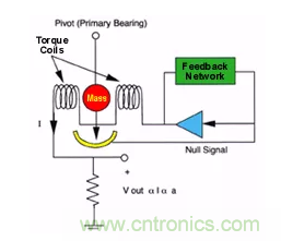 伺服加速度計(jì)如下所示,懸掛在鉸鏈上的是一個下垂的高磁導(dǎo)率質(zhì)量。“向下”或“零位置”由零檢測器檢測,平衡力由磁線圈提供。
