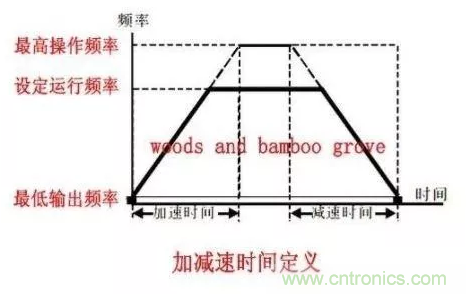 加速時間是指變頻器從【輸出最低頻率】(可設(shè)置如臺達01-00參數(shù))加速到【最高操作頻率】(可設(shè)置,如臺達01-05參數(shù))所需時間。