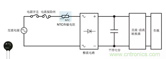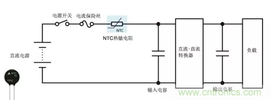 在簡單的直流電源電路(例如直流-直流轉(zhuǎn)換器)中,NTC熱敏電阻可用作電源熱敏電阻并有效地限制沖擊電流,而輸入和輸出電容在電源打開時即可開始充電。NTC熱敏電阻在通電后其電阻會大大降低,因此與使用固定電阻相比,其功率損耗更低。