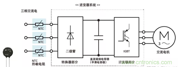 逆變器系統(tǒng)主要由轉(zhuǎn)換器級、逆變器級和直流側(cè)電容(平滑電容)組成,該電容放置在轉(zhuǎn)換器級之后,如下所示。上電時,器件會通過沖擊電流進行充電,而該沖擊電流的峰值是(為直流側(cè)電容充電的)穩(wěn)定電流的若干倍。該沖擊電流可能會對直流電容的使用壽命產(chǎn)生不利影響,或損壞半導(dǎo)體器件。為了防止沖擊電流,我們需要連接NTC熱敏電阻。