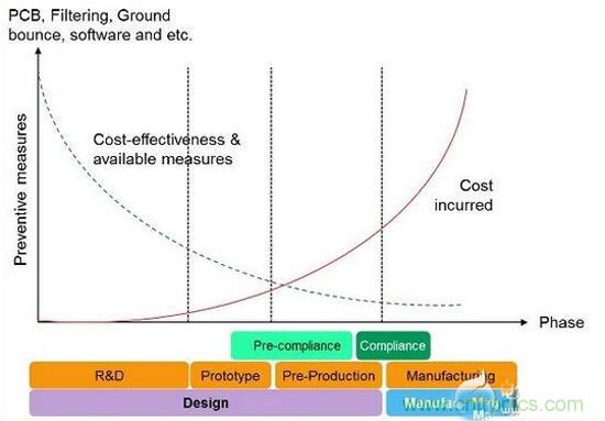 圖1:當(dāng)產(chǎn)品在開發(fā)階段一步步推進(jìn)時(shí),變更所承擔(dān)的潛在成本上升,清除EMI問題的可用措施逐步受到限制。