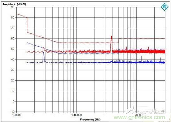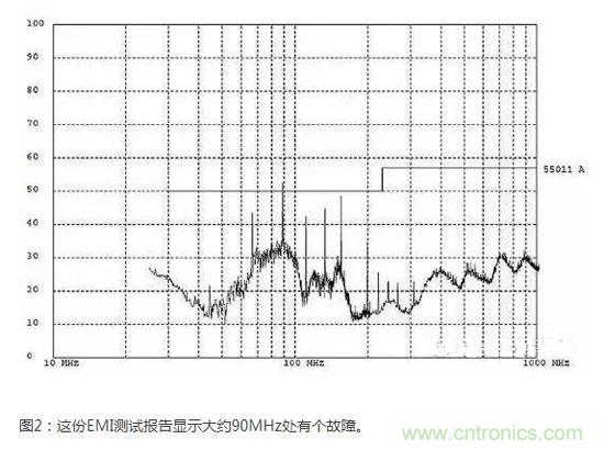 請(qǐng)看圖2所示的EMI測(cè)試報(bào)告,這份報(bào)告顯示大約90MHz處有個(gè)故障。