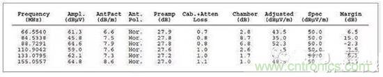 在圖3所示的余量欄中,你可以看到有一個(gè)峰值超出了這個(gè)規(guī)范標(biāo)準(zhǔn)在88.7291MHz處規(guī)定的極限,與規(guī)范相差-2.3。