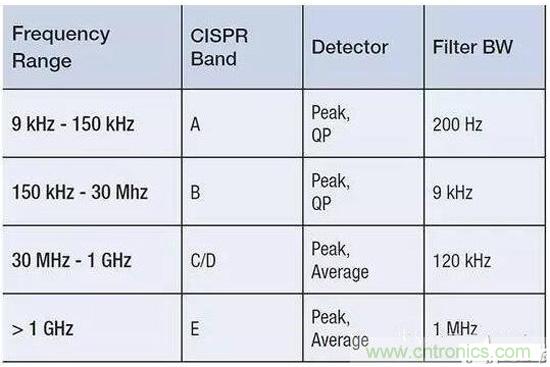 表1:CISPR測(cè)試要求根據(jù)不同頻率范圍而有所變化,并影響頻率分辨率。