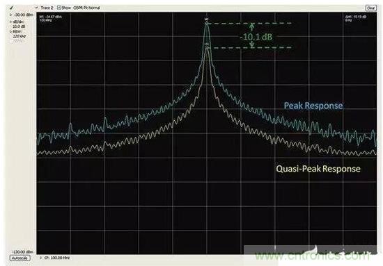 圖4:峰值檢測(cè)和準(zhǔn)峰值檢測(cè)的比較。