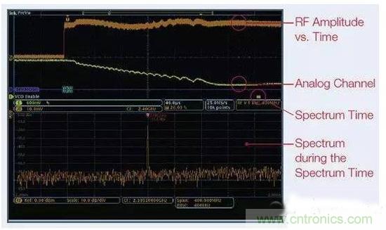 圖6:這張圖顯示了MDO提供的時(shí)間關(guān)聯(lián)觀察功能,圖中顯示了射頻幅度與時(shí)間的關(guān)系軌跡。