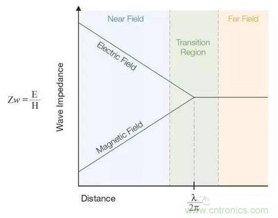 圖7:這張圖顯示了近場(chǎng)和遠(yuǎn)場(chǎng)中的波阻行為以及兩者之間的過渡區(qū)。近場(chǎng)測(cè)量可用于EMI排查。