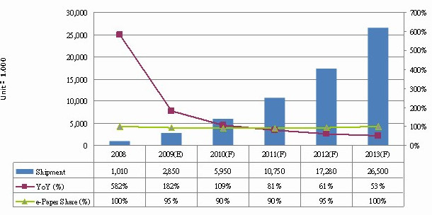 面對日漸增長的電子書市場,柏德葳表示,未來將隨來自不同領(lǐng)域的廠商投入而出現(xiàn)明顯增長,以2008、2009年為例,市場由Amazon及Sony兩大廠商所盤據(jù),總市占率逾70%,但2009年市場總出貨量不到300萬臺,隨著2010年更多廠商投入,成本隨之下滑,電子閱讀器市場將開始明顯增長。