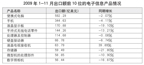 2009年1-11月,電子信息產(chǎn)品累計進(jìn)出口總額6868.78億美元,同比下降16.66%,比全國商品進(jìn)出口總額降幅低0.8個百分點,占全國外貿(mào)進(jìn)出口總額的34.97%。