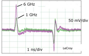 隨著脈沖信號(hào)上升沿的加快,信號(hào)所包含的諧波成分也越來越豐富。對(duì)于同一個(gè)脈沖信號(hào),使用不同帶寬的示波器所測(cè)量出的結(jié)果可能是不同的。例如,下圖一所示的脈沖測(cè)量中,使用1G帶寬的示波器測(cè)量到的脈沖幅度僅為使用6G示波器測(cè)量值的一半。