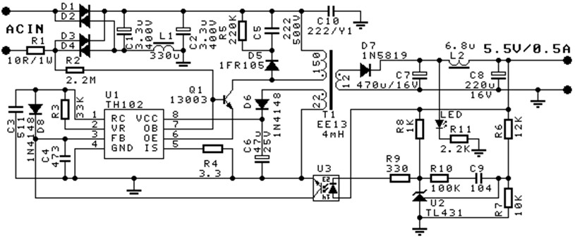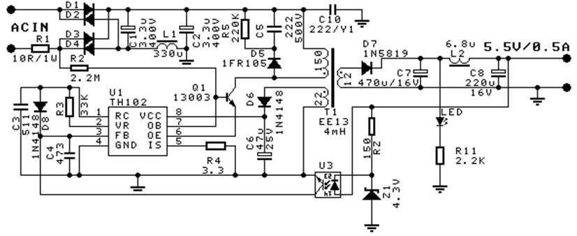 TH102采用穩(wěn)壓管、光耦發(fā)光管(圖2中Z1、U3、RZ)為輸出電壓基準(zhǔn),RZ基于光耦發(fā)光管壓降為Z1提供基電流,改變?cè)摶娏鳎雀淖僐Z)可小幅改變Z1穩(wěn)壓值,因此,若需較高精度輸出電壓可調(diào)校RZ,調(diào)校RZ可采用成批穩(wěn)壓管分為幾檔,每檔穩(wěn)壓管對(duì)應(yīng)一個(gè)RZ;或TH102采用TL431(圖3中U2、R6、R7、R8、R9、R10、C9)電路為輸出電壓基準(zhǔn),基準(zhǔn)精度較高和無需調(diào)校。TH102采用光耦隔離反饋電路(圖2中Z1、U3、RZ、C4,圖3中U2、R6、R7、R8、R9、R10、C9、C4)。