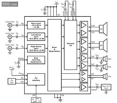 如圖三之3D強(qiáng)化立體聲方塊圖所示,一外接之電阻與電容電路用以控制3D強(qiáng)化立體聲之音效,用兩個(gè)分別的電阻與電容電路來控制立體聲揚(yáng)聲器與立體聲耳機(jī),如此可達(dá)到最佳之3D強(qiáng)化立體聲效果。