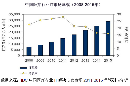 區(qū)域醫(yī)療信息平臺(tái)建設(shè)已逐步成為醫(yī)療信息化發(fā)展的引擎,醫(yī)療信息化市場(chǎng)繼續(xù)高速增長(zhǎng)。根據(jù)IDC最近發(fā)布的報(bào)告《中國(guó)醫(yī)療行業(yè)IT解決方案市場(chǎng)2011-2015年預(yù)測(cè)與分析》,2010年醫(yī)療行業(yè)IT花費(fèi)是114.1億元人民幣,較2009增長(zhǎng)26.7%;預(yù)測(cè)到2015年IT花費(fèi)市場(chǎng)規(guī)模達(dá)到290.2億元,2010至2015年的年復(fù)合增長(zhǎng)率為20.5%。在各類醫(yī)療解決方案中,區(qū)域醫(yī)療信息平臺(tái)的增長(zhǎng)最快,2010-2015年復(fù)合增長(zhǎng)率達(dá)24.7%。