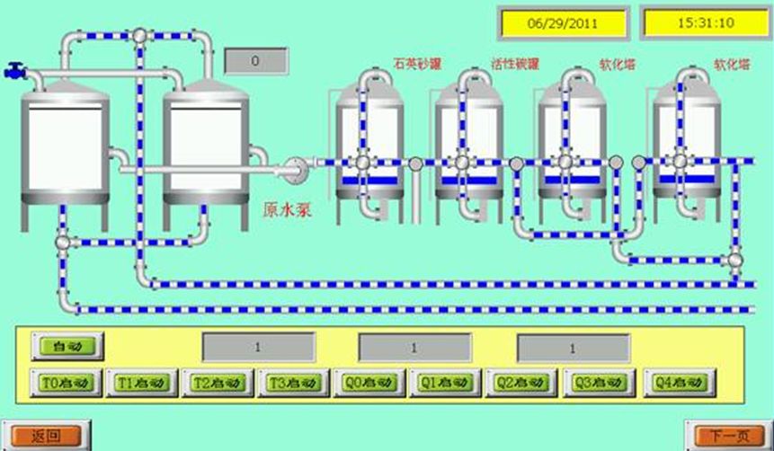 制藥用水是不含任何添加物的工藝用水。制藥用水的系統(tǒng)控制要控制這些雜質的含量,同時還要有效處理和控制微生物及細菌內毒素的污染。通常會采用離子樹脂交換、蒸餾冷凝、電滲析、反滲透等工藝方式。其制備流程大致分為五部分:預處理、初級除鹽裝置、深度除鹽裝置、后處理裝置、純水輸送分配系統(tǒng)。純化水設備包含機械部分和電氣部分:機械部分主要由水泵、壓力罐、水箱、電磁閥、過濾器和管路組成;電氣部分主要由可編程控制器(PLC)、觸摸屏、變頻器、壓力表、繼電器等組成。圖1為制備純化水的一個現場展示案例。