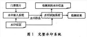 數(shù)字水印門票防偽系統(tǒng)由數(shù)字水印嵌入子系統(tǒng)和數(shù)字水印識(shí)別子系統(tǒng)兩部分組成,每個(gè)子系統(tǒng)又分別由硬件與軟件兩部分組成。使用者可以通過在門票的印刷品中嵌入不能為肉眼覺察且不影響所保護(hù)印刷品原有的視覺感觀形象的數(shù)字水印密鑰,并通過特有的檢測(cè)設(shè)備——機(jī)讀設(shè)備來讀取該數(shù)字水印,以鑒別印刷品的真?zhèn)?,從而達(dá)到防偽目的。