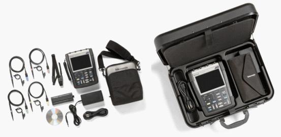 手持示波器經(jīng)常用于進(jìn)行電機(jī)驅(qū)動(dòng)器、功率變換器/逆變器和功率半導(dǎo)體器件的功率測(cè)量。通過(guò)結(jié)合使用泰克的廣泛電壓和電流探頭,THS3000系列手持示波器可進(jìn)行這些測(cè)量。其四個(gè)輸入通道中的每個(gè)通道均可進(jìn)行配置,以匹配探頭類型和衰減系數(shù),確保正確的測(cè)量和光標(biāo)讀數(shù)。該產(chǎn)品標(biāo)配4個(gè)新型的 300 MHz CAT III 安全等級(jí)探頭,也標(biāo)配了OpenChoice軟件,像以前使用泰克臺(tái)式示波器一樣方便。圖4中左圖為THS3000系列標(biāo)準(zhǔn)機(jī)型配件,包括 4 個(gè)探頭、電池、電源適配器和電源線、OpenChoice CD、校準(zhǔn)證書、系帶和軟提箱。圖4中右圖為TK 機(jī)型配件,包括4 個(gè)探頭、電池、電池適配器和電源線、 OpenChoice CD、校準(zhǔn)證書、系帶、探頭配件包、探頭盒和硬提箱。