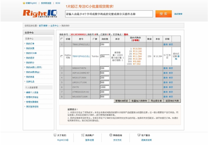 圖1:RightIC網站BOM單批量查詢功能的詢價頁面。