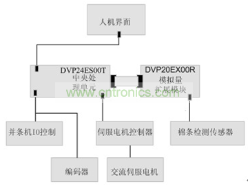 該控制系統(tǒng)的中央處理單元使用臺(tái)達(dá)DVP E系列的PLC,伺服控制系統(tǒng)使用臺(tái)達(dá)ASDA系列產(chǎn)品,人機(jī)界面使用選配DOP-B系列觸摸屏。工作時(shí),PLC通過(guò)DVP20EX00R模擬量控制模塊讀取棉條檢測(cè)傳感器的棉條厚度,對(duì)編碼器信號(hào)的處理計(jì)算出勻整1羅拉的速度,依據(jù)勻整控制關(guān)系式,就可計(jì)算出勻整2羅拉的轉(zhuǎn)速,再通過(guò)伺服控制器控制伺服電機(jī),以達(dá)到對(duì)勻整2羅拉的控制。