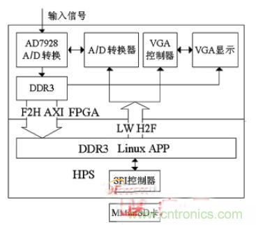 數(shù)字系統(tǒng)包括A/D 轉(zhuǎn)換模塊、VGA 顯示模塊、數(shù)據(jù)存儲(chǔ)模塊和算法處理模塊。SoC FPGA 中的HPS 和其它的硬件模塊可以通過(guò)Qsys 進(jìn)行配置,用Quartus II 進(jìn)行硬件設(shè)計(jì),Qsys 和Quartus II 編譯可以產(chǎn)生軟件設(shè)計(jì)所需的信息文件。移植嵌入式Linux 系統(tǒng),下載sof 文件,用DS—5 進(jìn)行基于Linux 的系統(tǒng)軟件工程開(kāi)發(fā)。