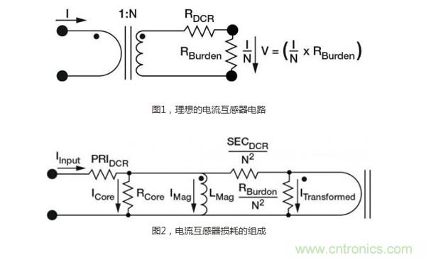 電流互感器(圖1)有三個(gè)突出優(yōu)點(diǎn):與線電壓隔離,無(wú)損測(cè)量電流,大信號(hào)電壓能很好地抵御噪聲。這種間接測(cè)量電流的方法要求用到變化的電流,例如交流電,瞬變電流或開關(guān)式直流電,來(lái)產(chǎn)生一個(gè)磁耦合到次級(jí)繞組里的變化磁場(chǎng)。次級(jí)測(cè)量電壓可以根據(jù)在初級(jí)和次級(jí)繞組間的匝數(shù)比實(shí)現(xiàn)縮放。這種測(cè)量方法被認(rèn)為是“無(wú)損的”,因?yàn)殡娐冯娏魍ㄟ^(guò)銅繞組時(shí)的電阻損耗非常小。但是,如圖2所示,由于負(fù)載電阻、芯損,以及初級(jí)和次級(jí)直流電阻的存在,互感器的損耗會(huì)導(dǎo)致失去一小部分能量。