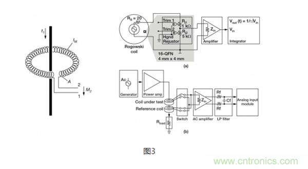 羅氏線圈(圖3)類似于電流互感器,會(huì)在次級(jí)線圈內(nèi)會(huì)感應(yīng)產(chǎn)生一個(gè)電壓,電壓大小與流經(jīng)隔離電感器的電流程正比。特殊之處在于,羅氏線圈采用的是氣芯設(shè)計(jì),這一點(diǎn)與依賴層壓鋼等高磁導(dǎo)率鐵芯和次級(jí)繞組磁耦合的電流互感器完全不同。氣芯設(shè)計(jì)的電感較小,有更快的信號(hào)響應(yīng)和非常線性的信號(hào)電壓。由于采用了這種設(shè)計(jì),羅氏線圈經(jīng)常被用在像手持電表這樣的已有接線上,臨時(shí)性地測(cè)量電流,可以認(rèn)為是電流互感器的低成本替代方案。