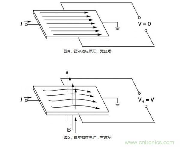 當(dāng)一個(gè)帶電流的導(dǎo)體被放進(jìn)磁場(chǎng)里時(shí)(圖4),在垂直于磁場(chǎng)和電流流動(dòng)方向上會(huì)產(chǎn)生電位差。這個(gè)電位與電流大小成正比。在沒(méi)有磁場(chǎng)和電流流過(guò)時(shí),就沒(méi)有電位差。但如圖5所示,當(dāng)有磁場(chǎng)和電流流過(guò)時(shí),電荷與磁場(chǎng)相互作用,引起電流分布發(fā)生變化,這樣就產(chǎn)生了霍爾電壓。